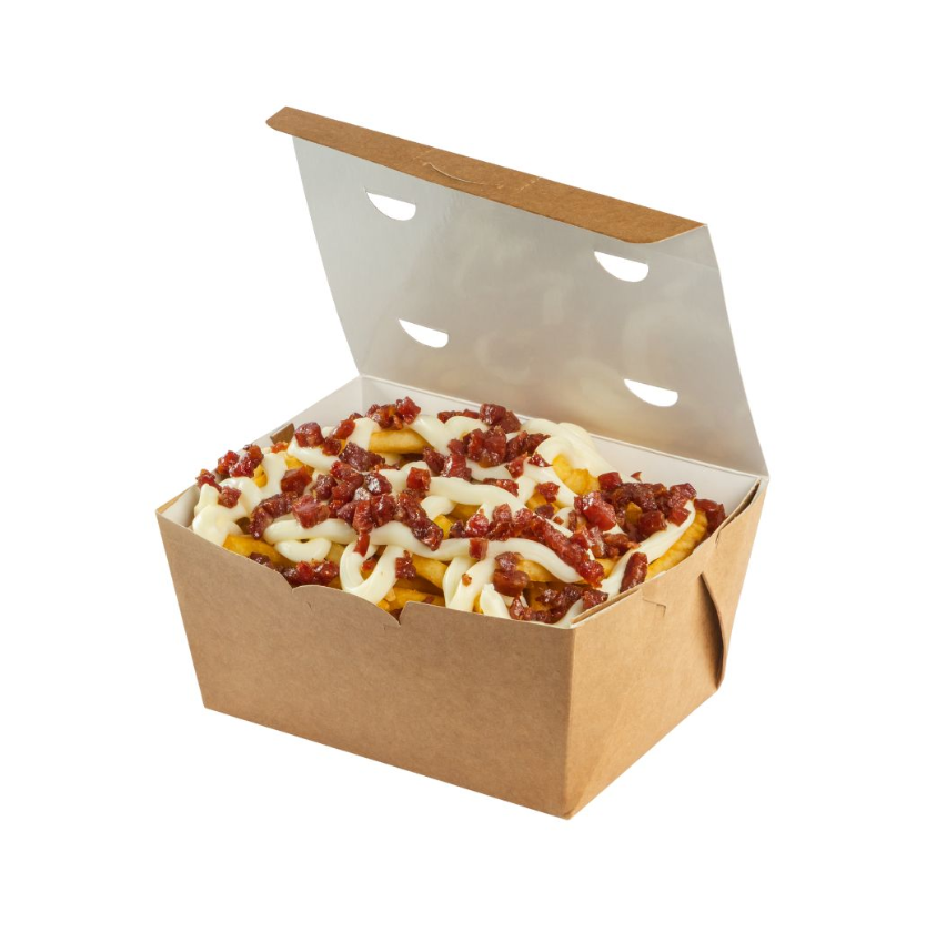 200g de batatas fritas Surecrisp Mccain, fininhas e crocantes, bacon em cubos e molho Cheddar cremoso.