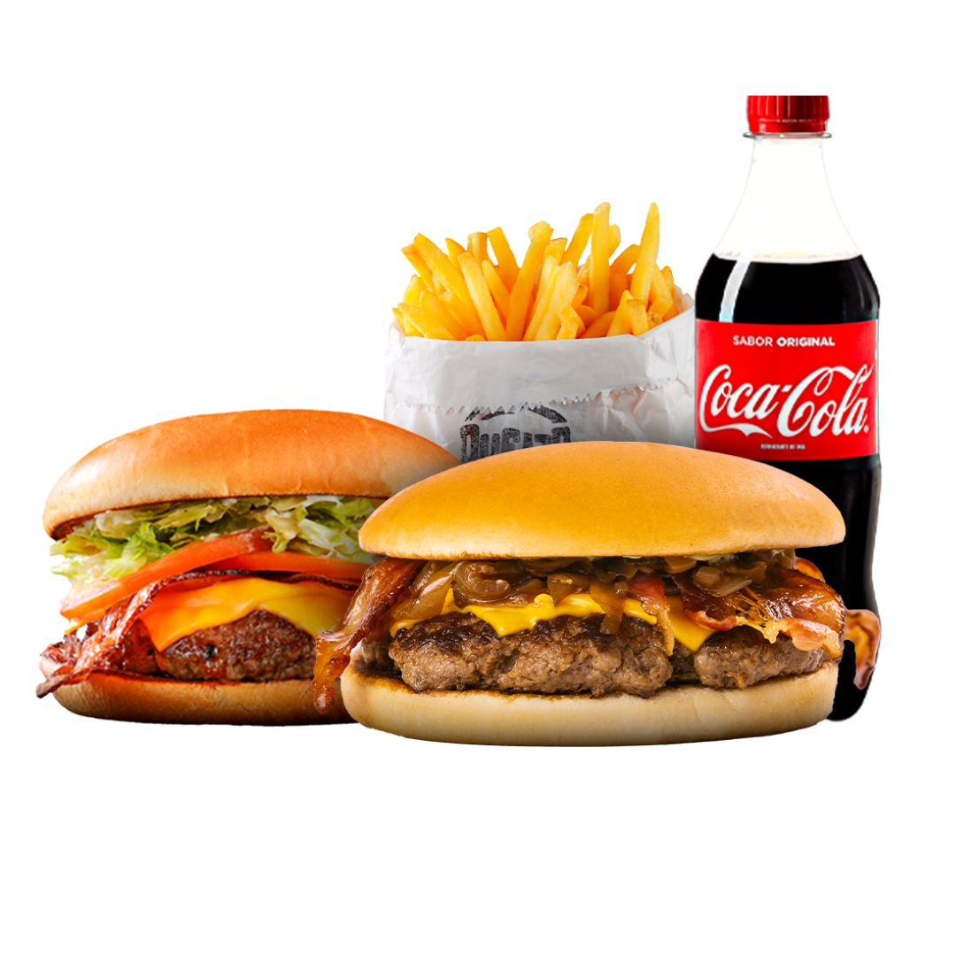 Você escolhe 2 burgers e o combo acompanha 2 porções de batatas fritas (100g cada) e 1 refrigerante Coca-Cola 600ml Original ou Zero.