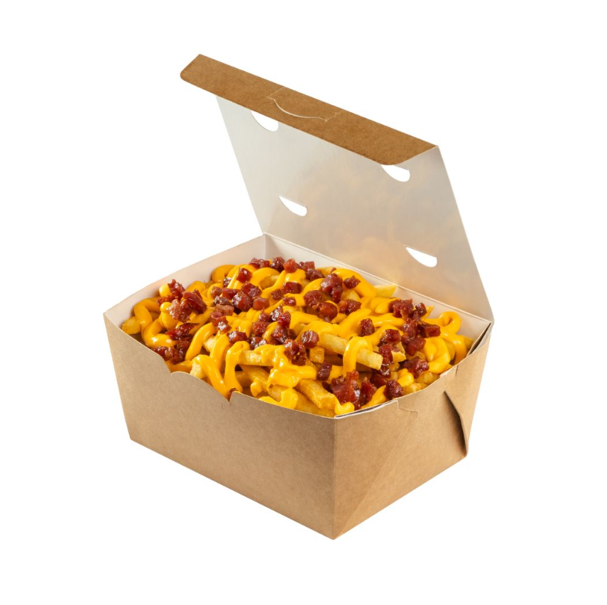 200g de batatas fritas Surecrisp Mccain, fininhas e crocantes, bacon em cubos e molho Cheddar cremoso.
